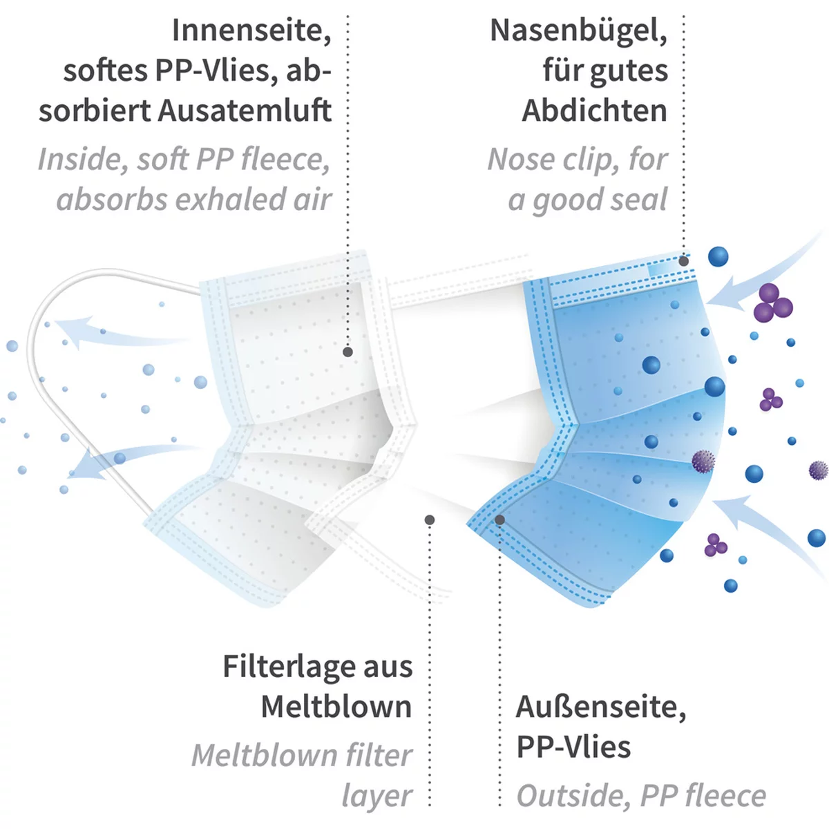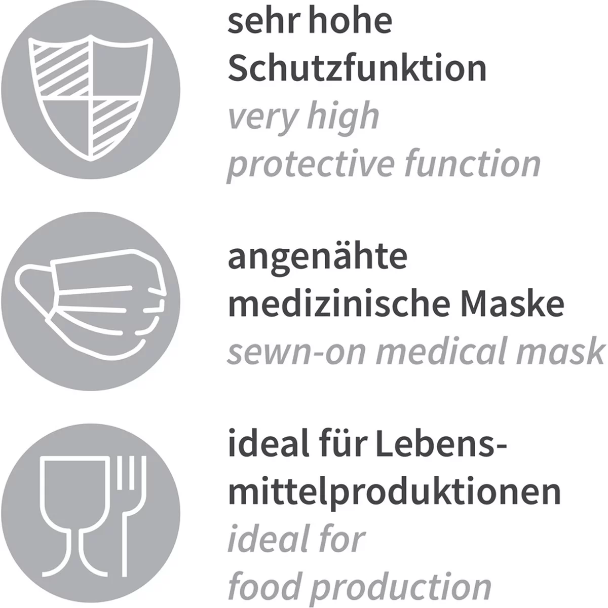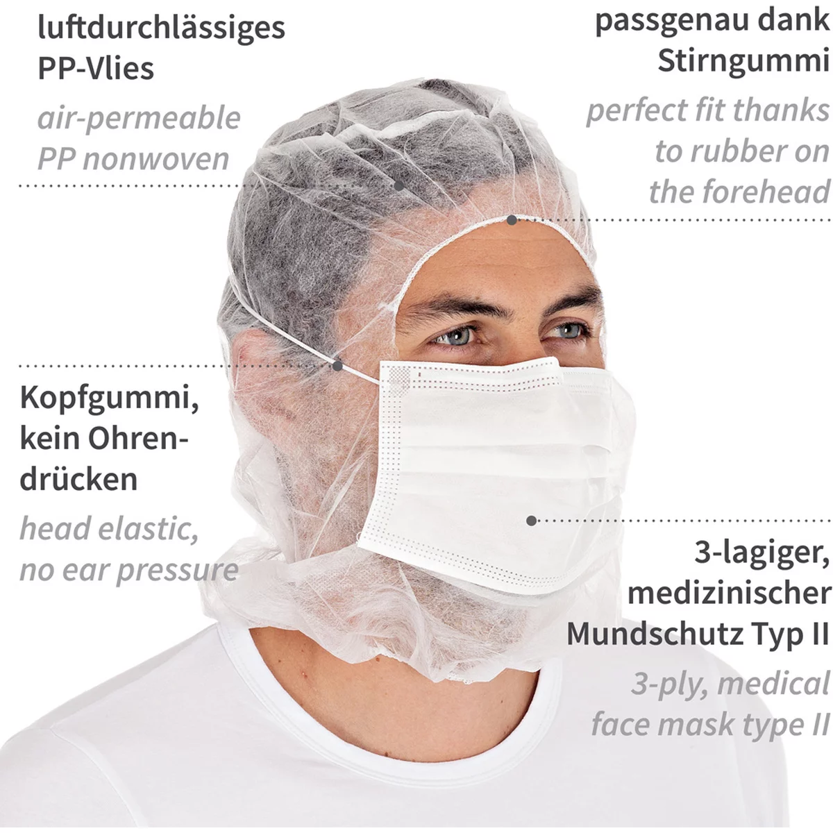 Diese Astrohauben aus PP-Vlies erfüllen einen äußert hohen Hygienestandard, da sie mit einem 3-lagigen, medizinischen Mundschutz ausgestattet sind. Seit Coronaausbrüchen ist die medizinische Maske vielerorts in Fleischproduktionen gesetzlich vorgeschrieben und auch sinnvoll. Denn diese Mundschutzmasken sind 3-lagig und haben eine geprüfte Filterleistung nach medizinischem Standard EN 14683 Typ II. Das bedeutet, dass das Risiko einer Ausbreitung möglicher Infektionen im Betrieb reduziert wird. Die integrierte Filterlage ermöglicht, dass mit Keimen oder Viren kontaminierte Aerosole beim Ausatmen in der Maske hängen bleiben. Die Maske schützt vor der Übertragung von Krankheitserregern durch Tröpfchen – vor allem beim Niesen, Husten, Sprechen.