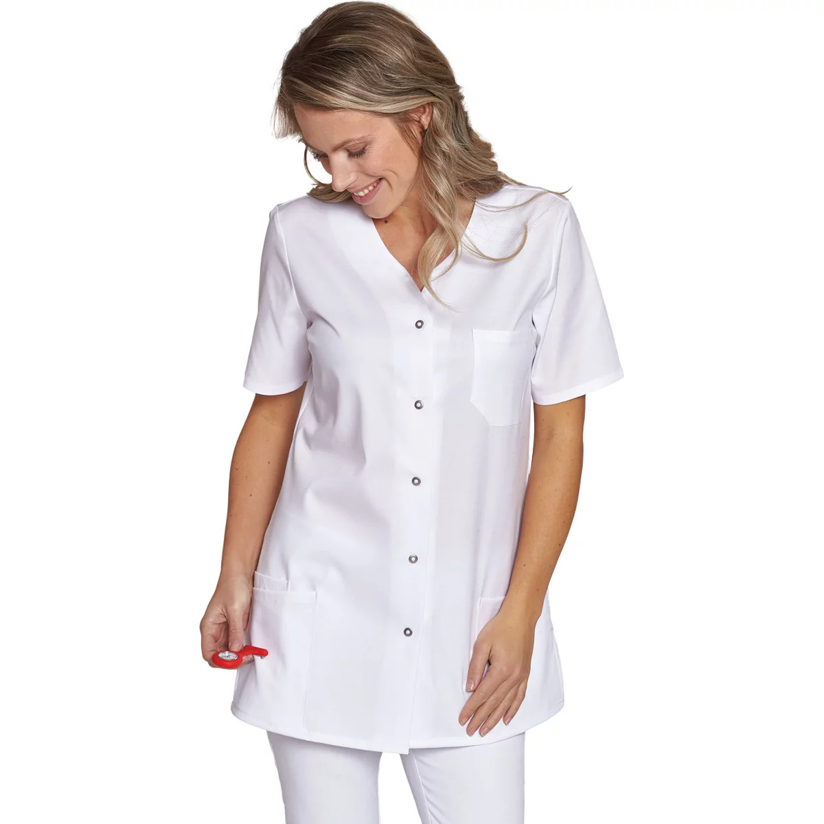 Kasack, Druckknopfleiste, 2 Seiten- und 1 Piepertasche, 1 Brusttasche, Seitenschlitze, Industriewäsche geeignet, 48% Lyocell (TENCEL™), 48% Polyester, 4% Elastolefin, ca. 180 g/m², Größen: 34 – 52, Länge: Gr. 38 = ca. 75 cm