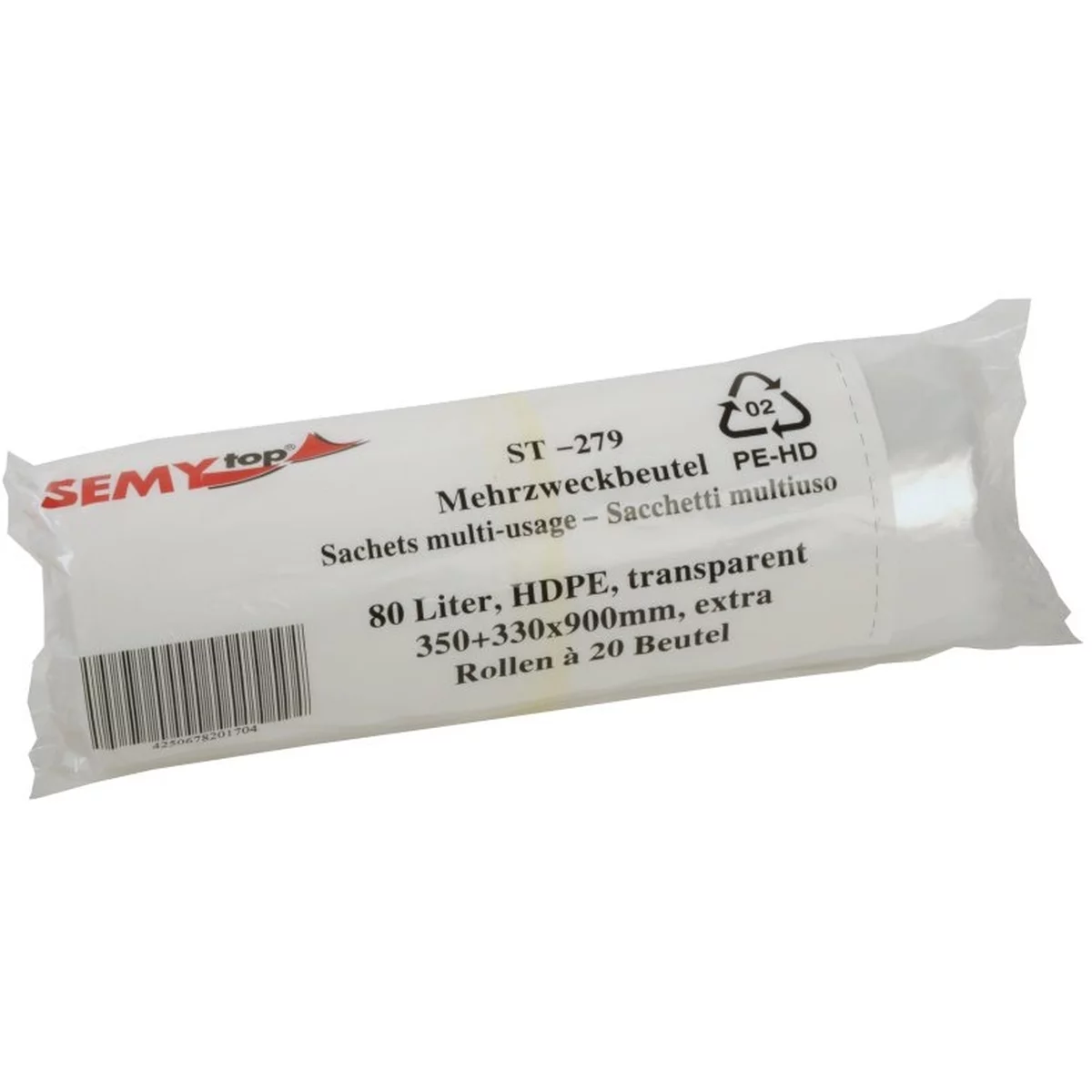 Mehrzweckbeutel, HDPE, 350 + 330 x 900 mm – extra, ca. 80 Liter, mit PP-Band, transparent – SemyTop – ST-279