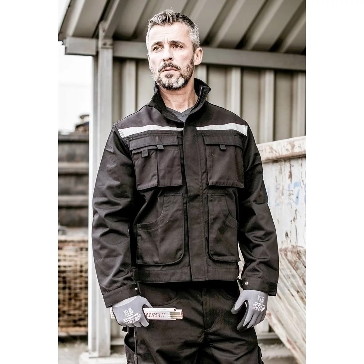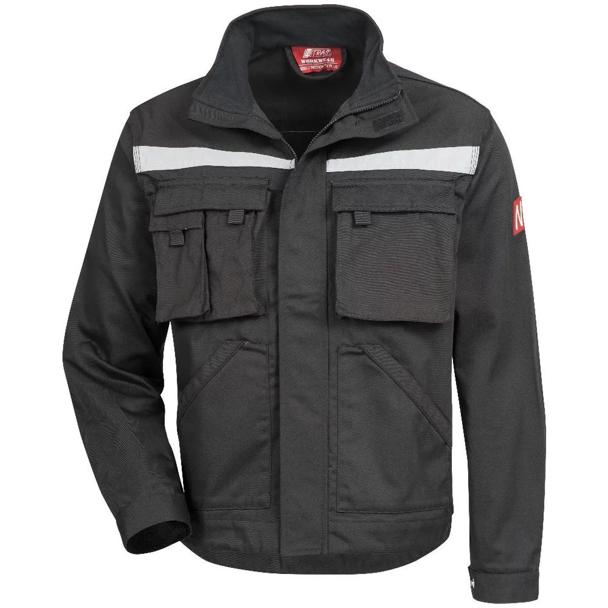 MOTION TEX PLUS, Arbeitsjacke, schwarz, 280 g/m2, durchgängiger Reißverschluss mit Kinnschutz, zwei Brusttaschen mit Patten und aufgesetzter Smartphone-Tasche, zwei Stifttaschen, Innentasche, zwei große Seitentaschen, verstellbare Ärmelabschlüsse mit Druckknöpfen, Reflexelemente, verstärkte Ellbogenpartie, verlängerter und verstärkter Rücken, Dreifachnähte, OEKO-TEX Standard 100