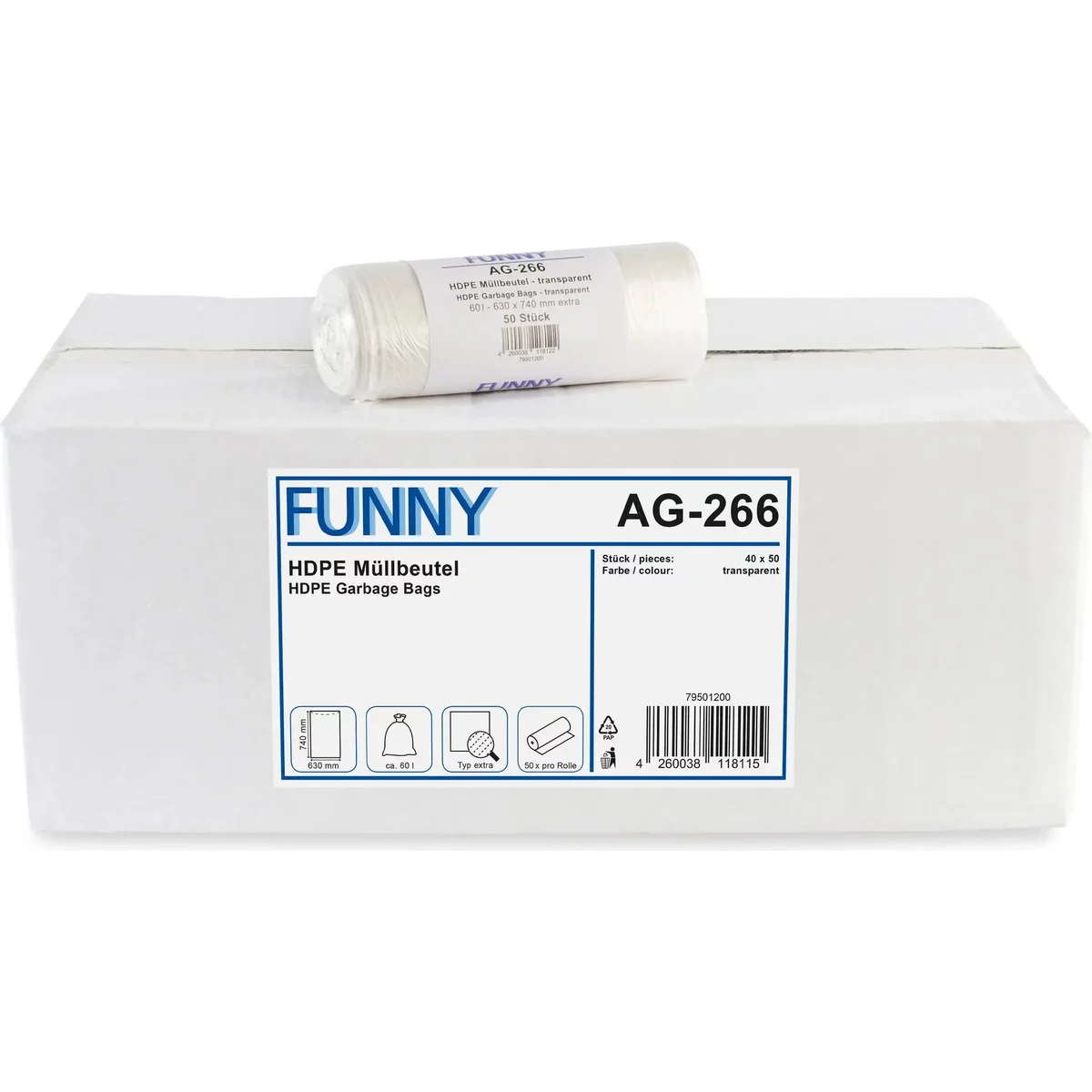 Müllbeutel, HDPE, 630 x 740 mm – extra, ca. 60 Liter, transparent – Funny – AG-266