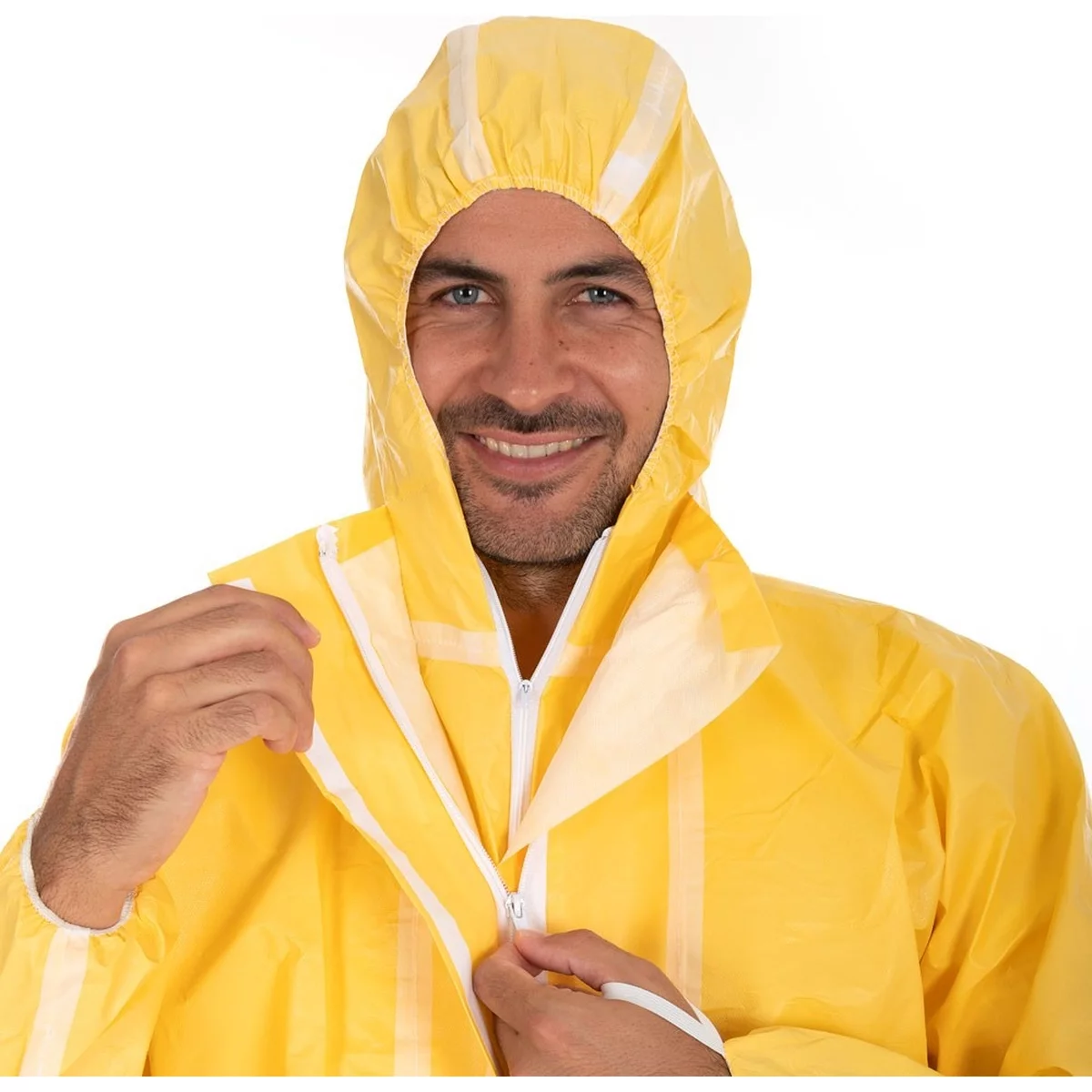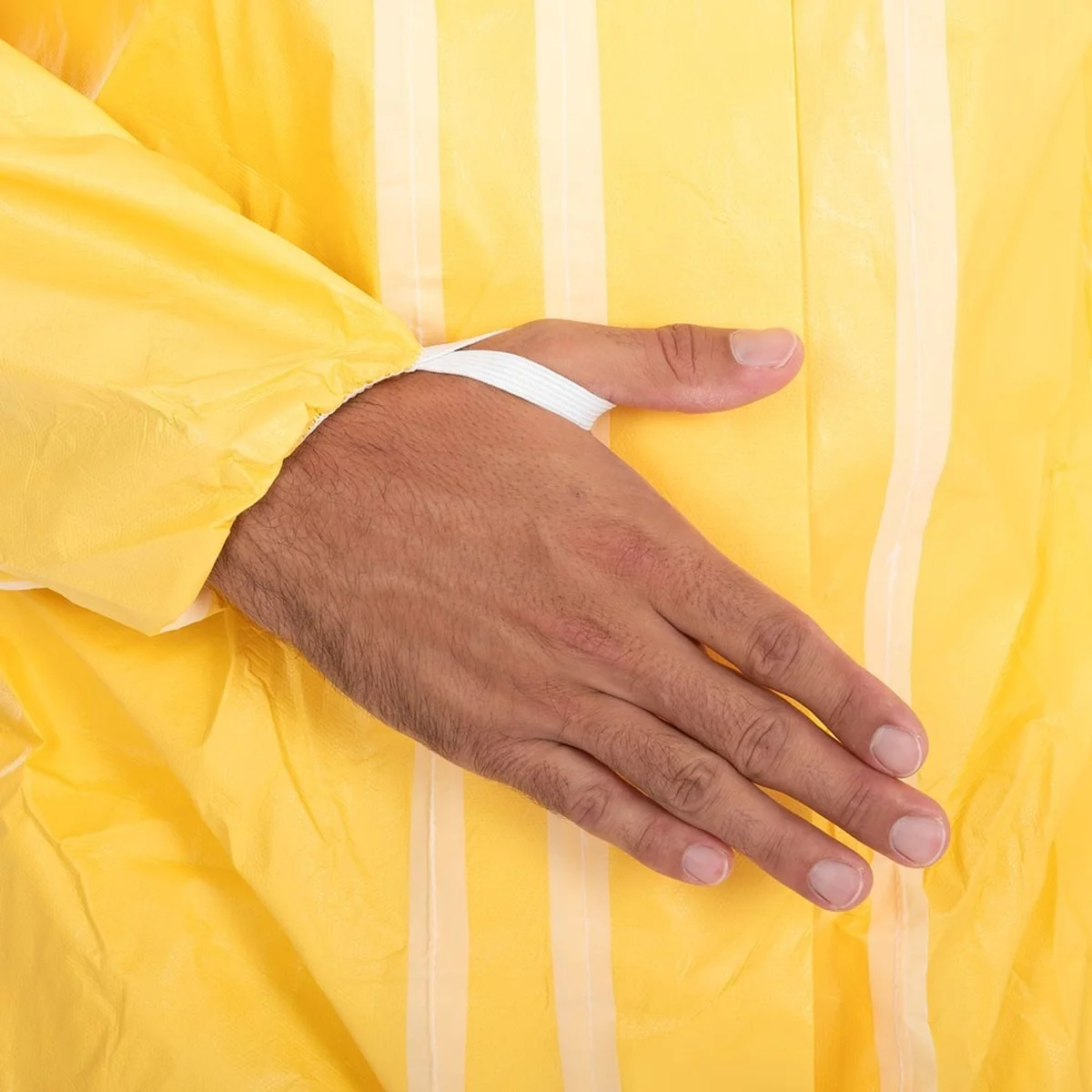 - Material: SMS stoffartig, Außenschicht: PE (Polyethylen) geprägt, Armabschluss: synthetischer Kautschuk