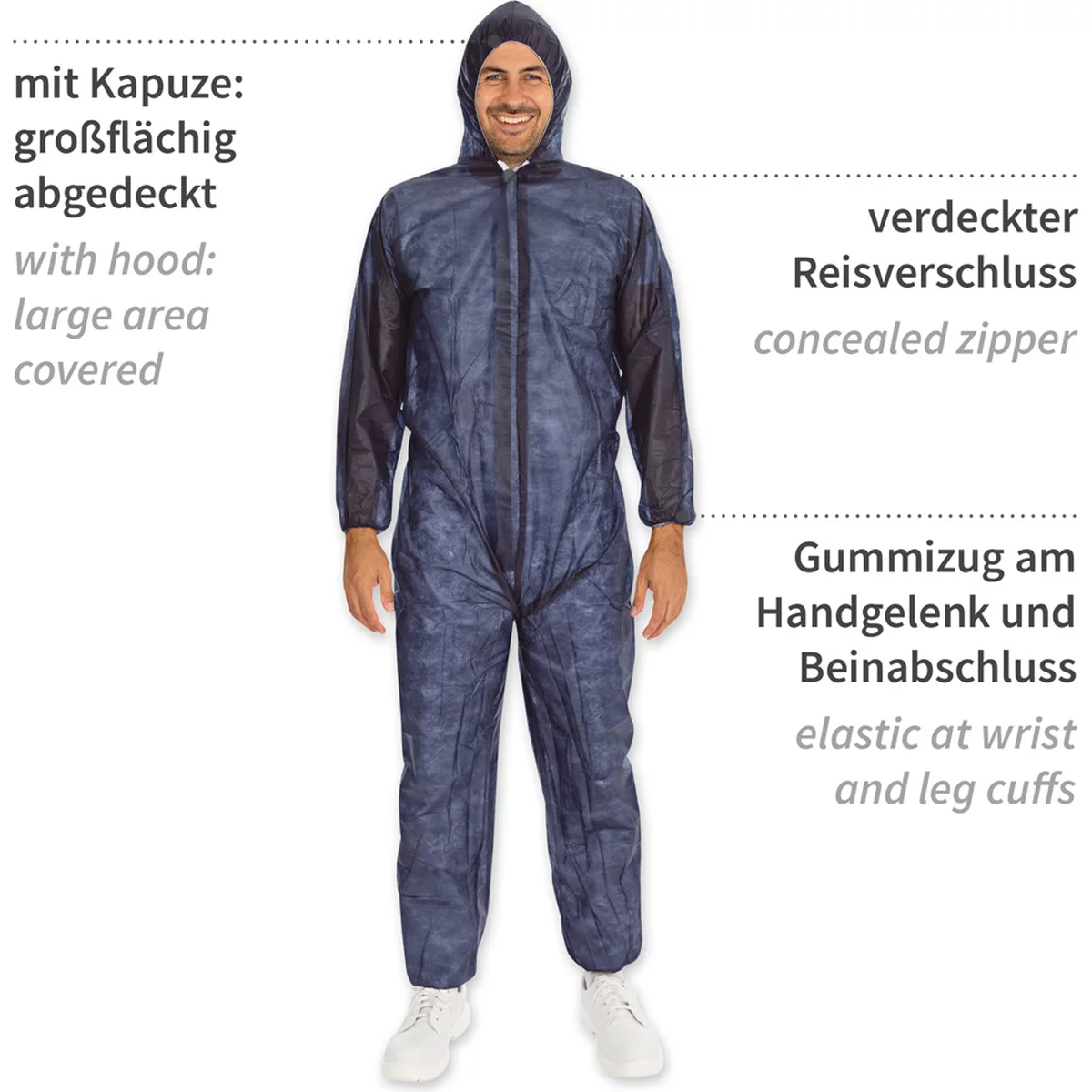 Die Overalls Light mit Kapuze sind ein leichter und günstiger Körperschutz für Lebensmittelbereiche, Industrie und Handwerk. Die Einweg-Overalls bestehen aus PP-Vlies und sind daher sehr luftdurchlässig und angenehm zu tragen.