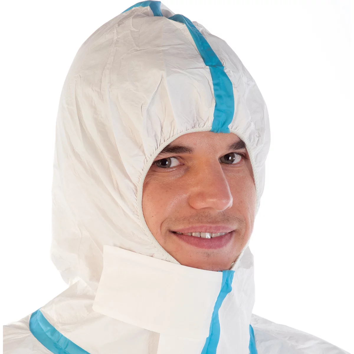 Diese Overalls sind besonders hochwertig und bieten einen zuverlässigen Schutz vor biologischen und chemischen Gefahren. Die Overalls erfüllen die Standards Typ 4B+5B+6B. Ihr Vorteil: Die Overalls sind sprühdicht und schützen vor Flüssigchemikalien sowie vor festen Partikeln. Sie bestehen aus so genanntem Microporous-Material – ein mikroporöses Vlies mit spezieller Funktionsmembran. Das Material sorgt dafür, dass die Overalls flüssigkeitsabweisend und gleichzeitig atmungsaktiv sind. Die Overalls sind eine hochwertige Schutzkleidung für Lebensmittelbereiche, Reinigungsarbeiten, Labor, Medizin, Pharmazie und viele andere Hygienebereiche