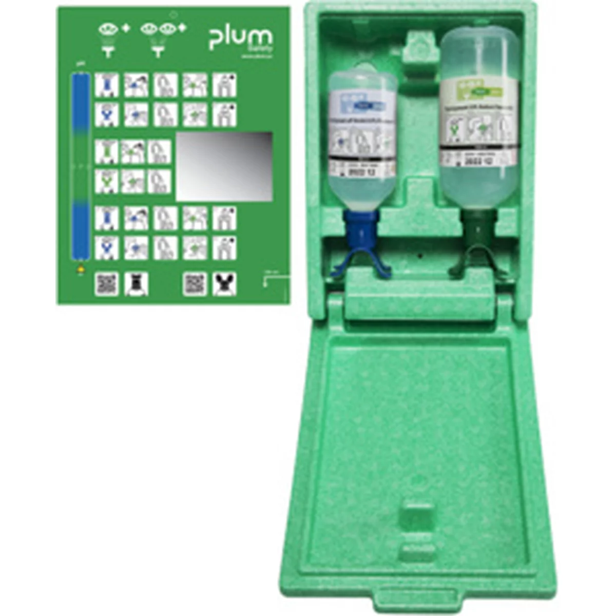 Staubgeschützte Wandbox mit 1 x 500 ml Augenspülflasche pH Neutral DUO (4,9 % Phosphat-pufferlösung) und 1 x 1,0 l Augenspüllösung DUO (0,9 % Natriumchloridlösung). Die Flaschen sind mit einem Augenaufsatz zum gleichzeitigen Spülen beider Augen ausgestattet. Incl. Befestigungsmaterial und Spiegel. Besonders für den Einsatz an Arbeitsplätzen geeignet, wo Säuren und Alkali sowie Fremdkörper in das Auge gelangen können. Spülzeit ca. 7 Minuten je Auge.