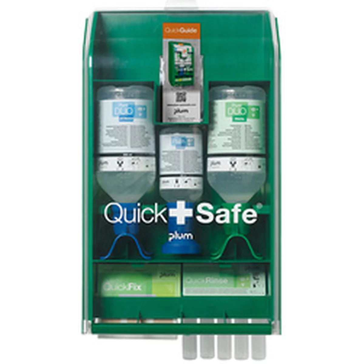 Wandbox aus schlagfestem Kunststoff mit transparentem Klappdeckel inkl. 1 x 500 ml Augenspülflasche DUO mit steriler 0,9 % Natriumchloridlösung zum gleichzeitigen Spülen beider Augen, 1 x 200 ml Augenspülflasche pH Neutral ,1 x 500 ml Augenspülflasche pH Neutral DUO zum gleichzeitigen Spülen beider Augen bei Verätzungsgefahr durch Säuren und Alkali, 5 Stk. QuickRinse 20 ml Augenspülampullen , 1 QuickFix Pflasterrefill mit 45 Stk. elastischen Pflastern. Lieferung inkl. Anwendungshinweisen und Befestigungsmaterial.