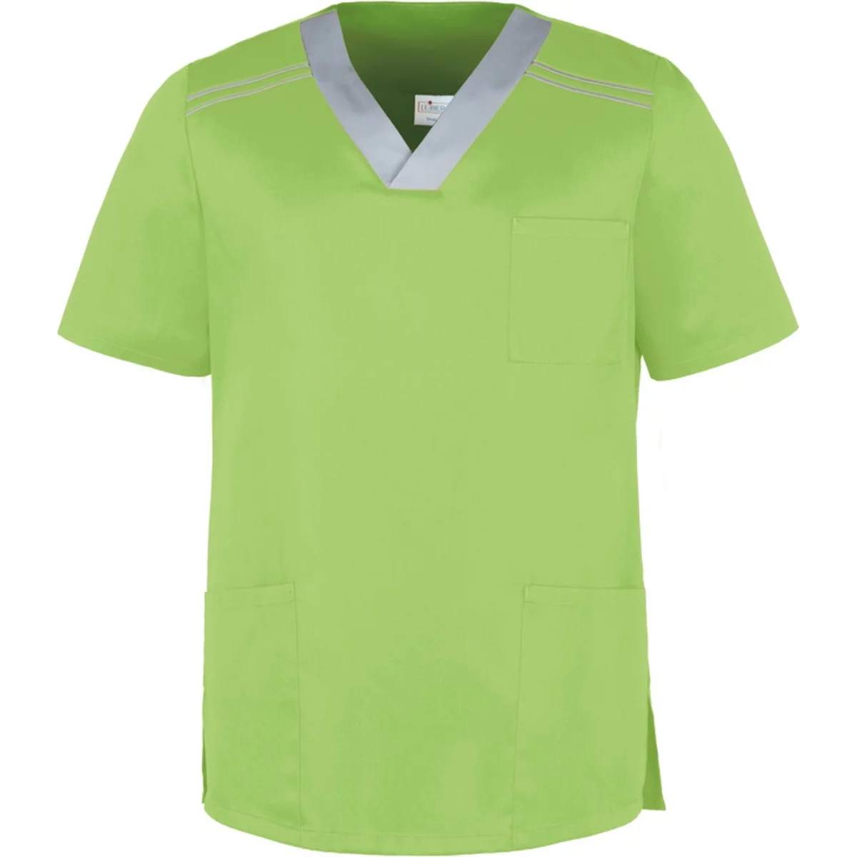Schlupfkasack, unisex, 2 aufgesetzte Seitentaschen, 1 Brusttasche, V-Ausschnitt mit Besatz in Kontrastfarbe, farbiger Besatz an Schulter, Seitenschlitze, Industriewäsche geeignet, 50% Baumwolle, 50% Polyester, ca. 150 g/m², Größen: XS – 3XL, Länge: Gr. M = ca. 76 cm